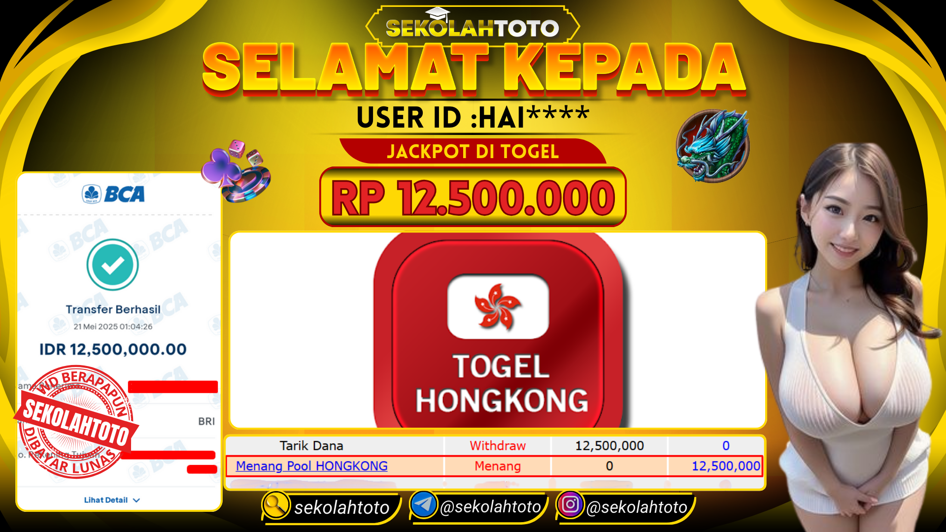 BUKTI PEMBAYAR JACKPOT TOGEL 21 Mei 2025 Posted by Sekolah Toto HONGKONG POOLS RABU, 21 MEI 2025 RP .12,500,000,- Selamat Kepada Pemenang. Salam JP Updated: 21 Mei 2025 at 04:10 ◀ Prediksi Togel Toto Macau Hari Ini BUKTI PEMBAYAR JACKPOT PRAGMATIC PLAY ▶