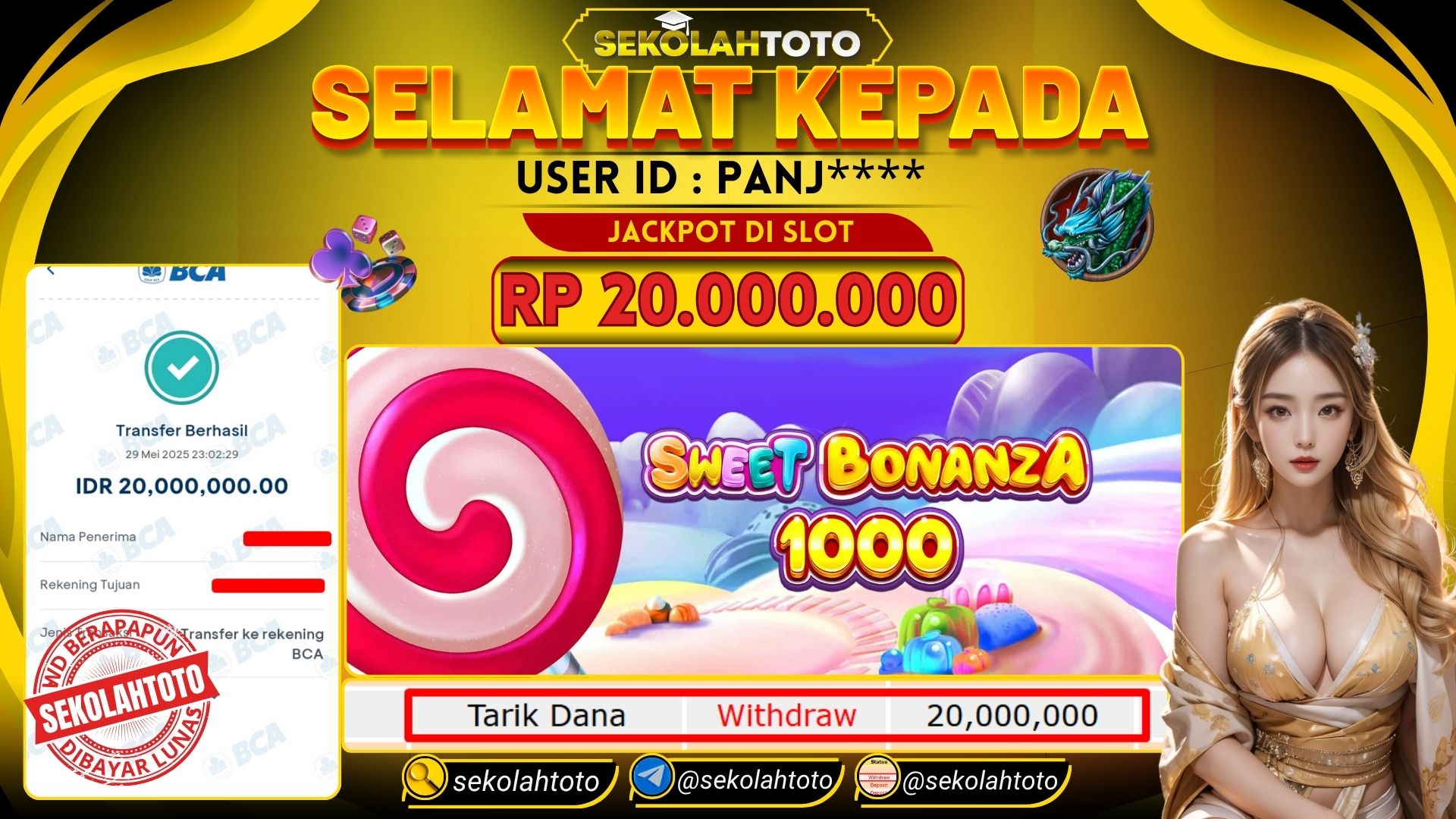 BUKTI PEMBAYARAN JACKPOT PRAGMATIC PLAY 29 Mei 2025 Posted by Sekolah Toto SWEET BONANZA 1000 KAMIS, 29 MEI 2025 RP 20,000,000,- Selamat Kepada Pemenang. Salam JP Updated: 29 Mei 2025 at 23:19 ◀ BUKTI PEMBAYARAN JACKPOT PRAGMATIC PL Prediksi Togel Bullseye Pools Hari Ini ▶
