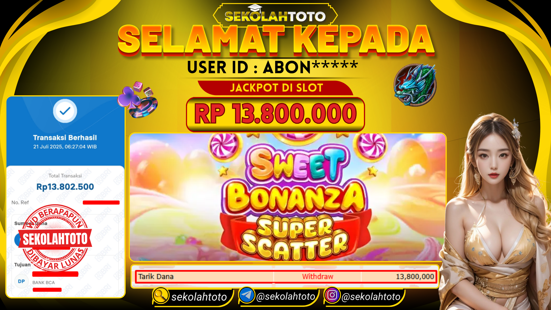 BUKTI PEMBAYARAN JACKPOT PRAGMATIC PLAY 21 Juli 2025 Posted by Sekolah Toto SWEET BONANZA SUPER SCATER SENIN , 21 JULI 2025 RP 13,800,000,- Selamat Kepada Pemenang. Salam JP Updated: 21 Juli 2025 at 08:37 ◀ Prediksi Togel Toto Macau Hari Ini Prediksi Togel Bullseye Pools Hari Ini ▶
