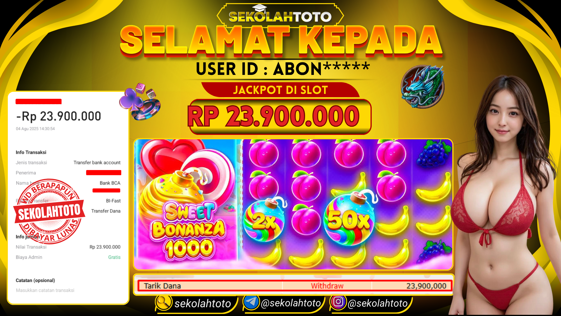 BUKTI PEMBAYARAN JACKPOT PRAGMATIC PLAY 4 Agustus 2025 Posted by Sekolah Toto SWEET BONANZA 1000 SENIN, 04 AGUSTUS 2025 RP 23,900,000,- Selamat Kepada Pemenang. Salam JP Updated: 4 Agustus 2025 at 19:19 ◀ BUKTI PEMBAYARAN JACKPOT PG SOFT BUKTI PEMBAYARAN JACKPOT PRAGMATIC PLAY ▶