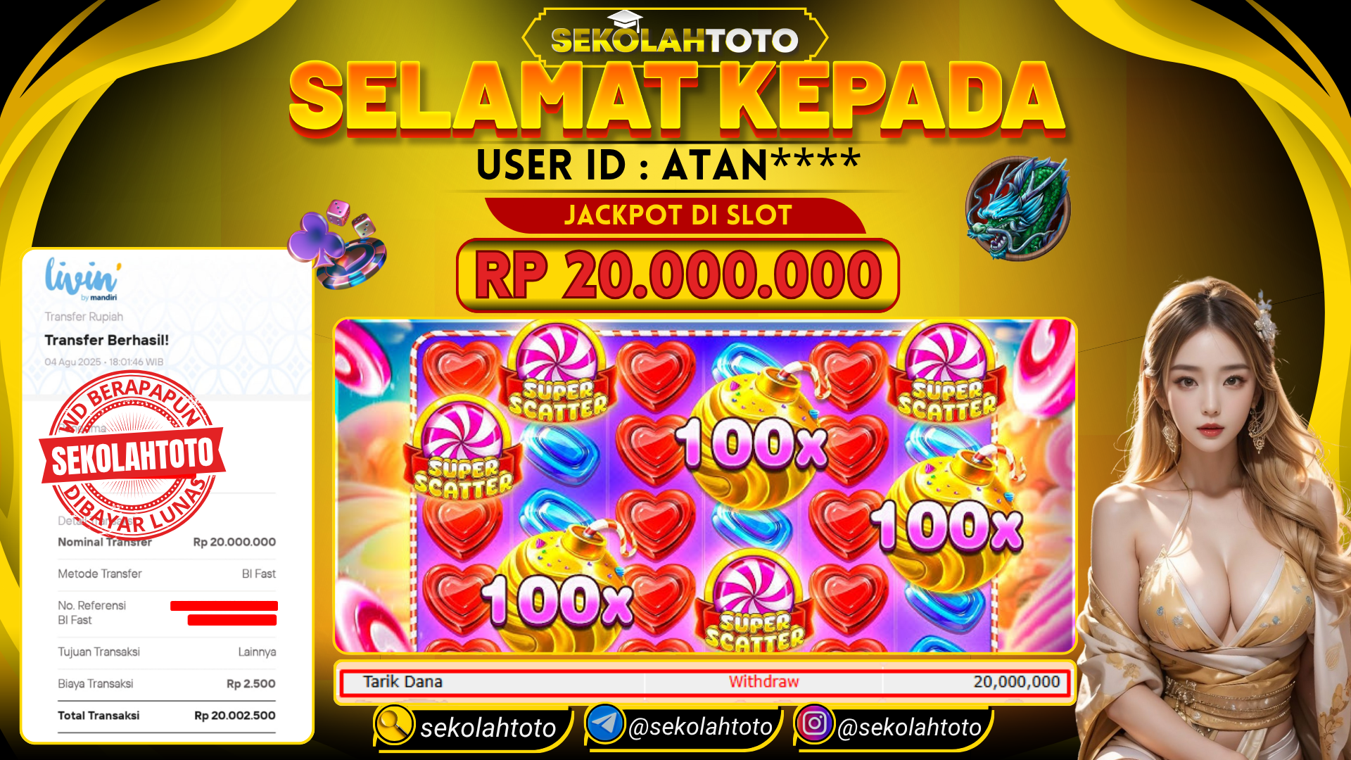 BUKTI PEMBAYARAN JACKPOT PRAGMATIC PLAY 4 Agustus 2025 Posted by Sekolah Toto SWEET BONANZA SUPER SCATTER SENIN, 04 AGUSTUS 2025 RP 20,000,000,- Selamat Kepada Pemenang. Salam JP Updated: 4 Agustus 2025 at 19:54 ◀ BUKTI PEMBAYARAN JACKPOT PRAGMATIC PLAY BUKTI PEMBAYARAN JACKPOT PRAGMATIC PLAY ▶