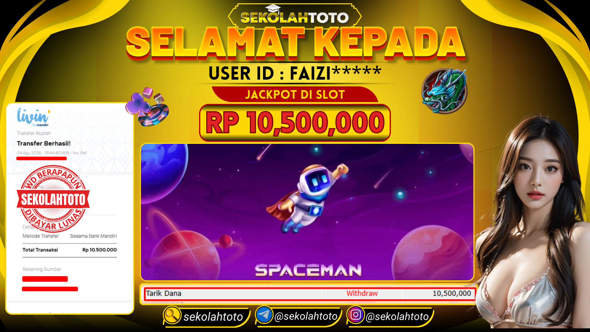 BUKTI PEMBAYARAN JACKPOT PRAGMATIC PLAY 4 Agustus 2025 Posted by Sekolah Toto SPACEMAN SENIN, 04 AGUSTUS 2025 RP 10,500,000,- Selamat Kepada Pemenang. Salam JP Updated: 4 Agustus 2025 at 20:35 ◀ BUKTI PEMBAYARAN JACKPOT PRAGMATIC PLAY Prediksi Togel Bullseye Pools Hari Ini ▶