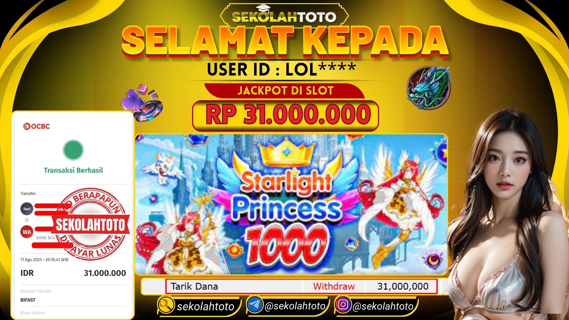BUKTI PEMBAYARAN JACKPOT PRAGMATIC PLAY 11 Agustus 2025 Posted by Sekolah Toto STARLIGHT PRINCESS 1000 MINGGU , 11 AGUSTUS 2025 RP 31,000,000,- Selamat Kepada Pemenang. Salam JP Updated: 11 Agustus 2025 at 20:32 ◀ BUKTI PEMBAYARAN JACKPOT PG SOFT BUKTI PEMBAYARAN JACKPOT PG SOFT ▶