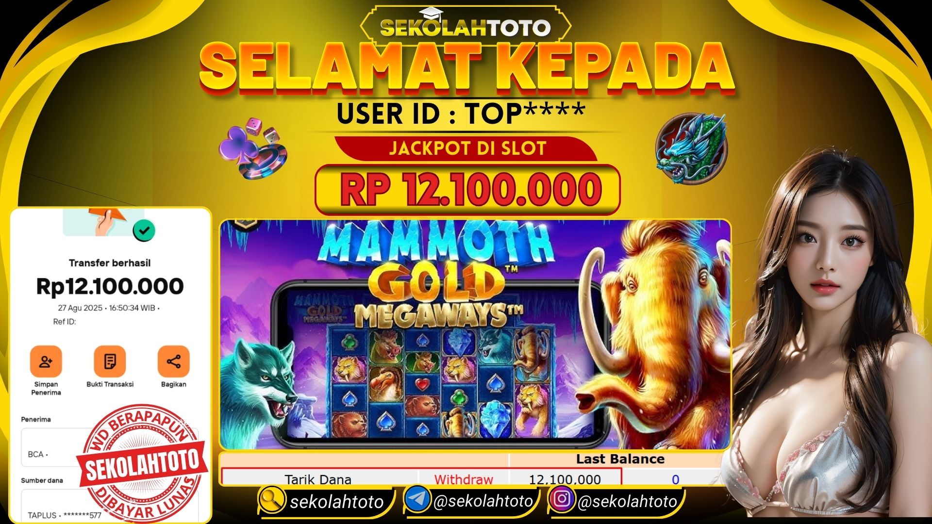 BUKTI PEMBAYARAN JACKPOT PRAGMATIC PLAY 27 Agustus 2025 Posted by Sekolah Toto MAMMOTH GOLD MEGAWAYS RABU , 27 AGUSTUS 2025 RP 12,100,000,- Selamat Kepada Pemenang. Salam JP Updated: 27 Agustus 2025 at 18:50 ◀ BUKTI PEMBAYARAN JACKPOT PGSOFT Prediksi Togel Bullseye Pools Hari Ini ▶