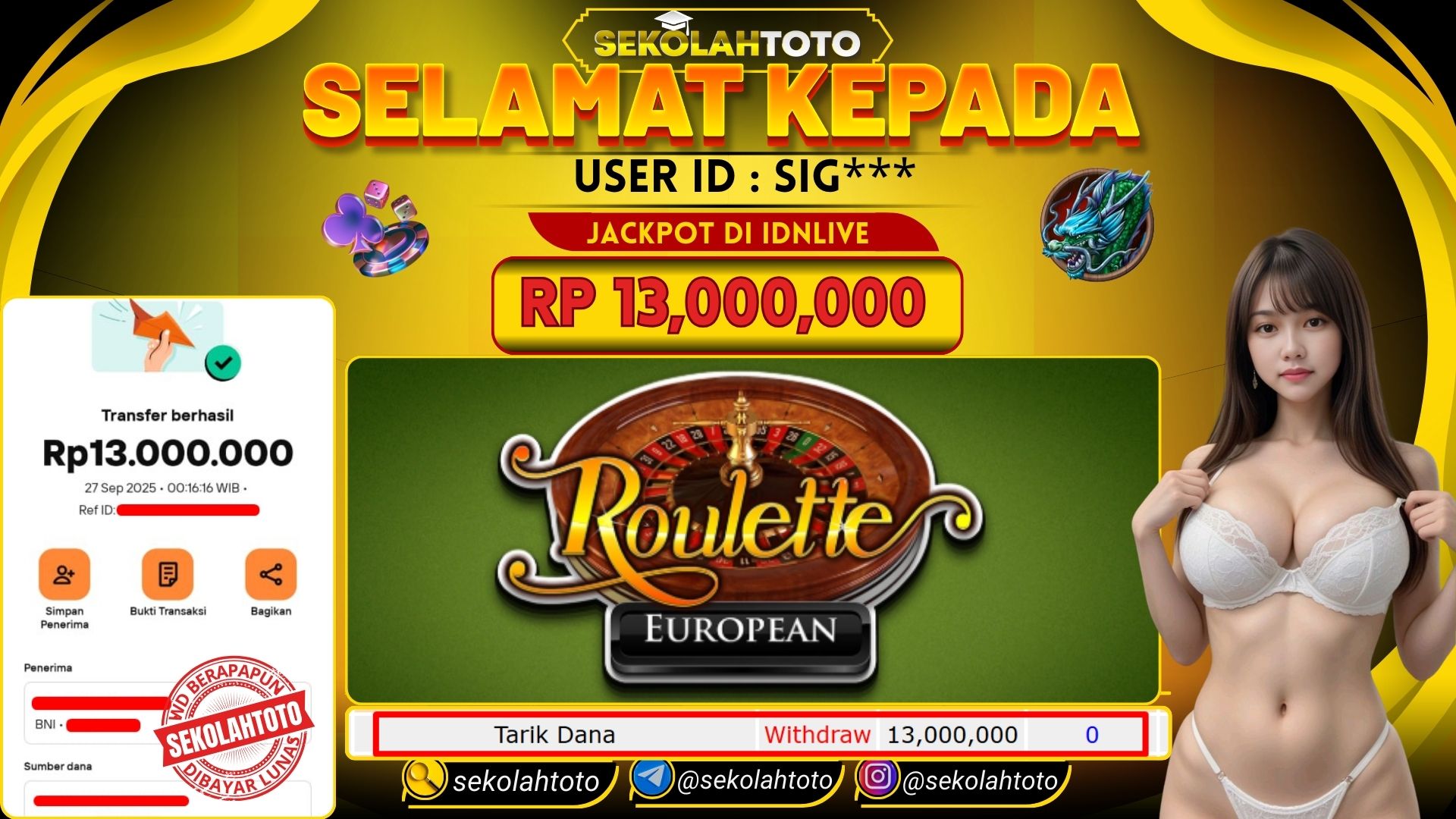 BUKTI PEMBAYARAN JACKPOT IDNLIVE 27 September 2025 Posted by Sekolah Toto ROULETTE EUROPEAN SABTU , 27 SEPTEMBER 2025 RP 13,000,000,- Selamat Kepada Pemenang. Salam JP Updated: 27 September 2025 at 03:02 ◀ BUKTI PEMBAYARAN JACKPOT PGSOFT BUKTI PEMBAYARAN JACKPOT PGSOFT ▶