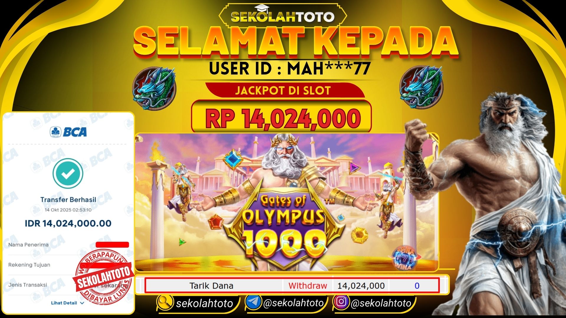 BUKTI PEMBAYARAN JACKPOT PRAGMATIC PLAY 14 Oktober 2025 Posted by Sekolah Toto GATES OF OLYMPUS 1000 SELASA , 14 OKTOBER 2025 RP 14,024,000,- Selamat Kepada Pemenang. Salam JP Updated: 14 Oktober 2025 at 02:59 ◀ Prediksi Togel Toto Macau Hari Ini BUKTI PEMBAYARAN JACKPOT PRAGMATIC PLAY ▶